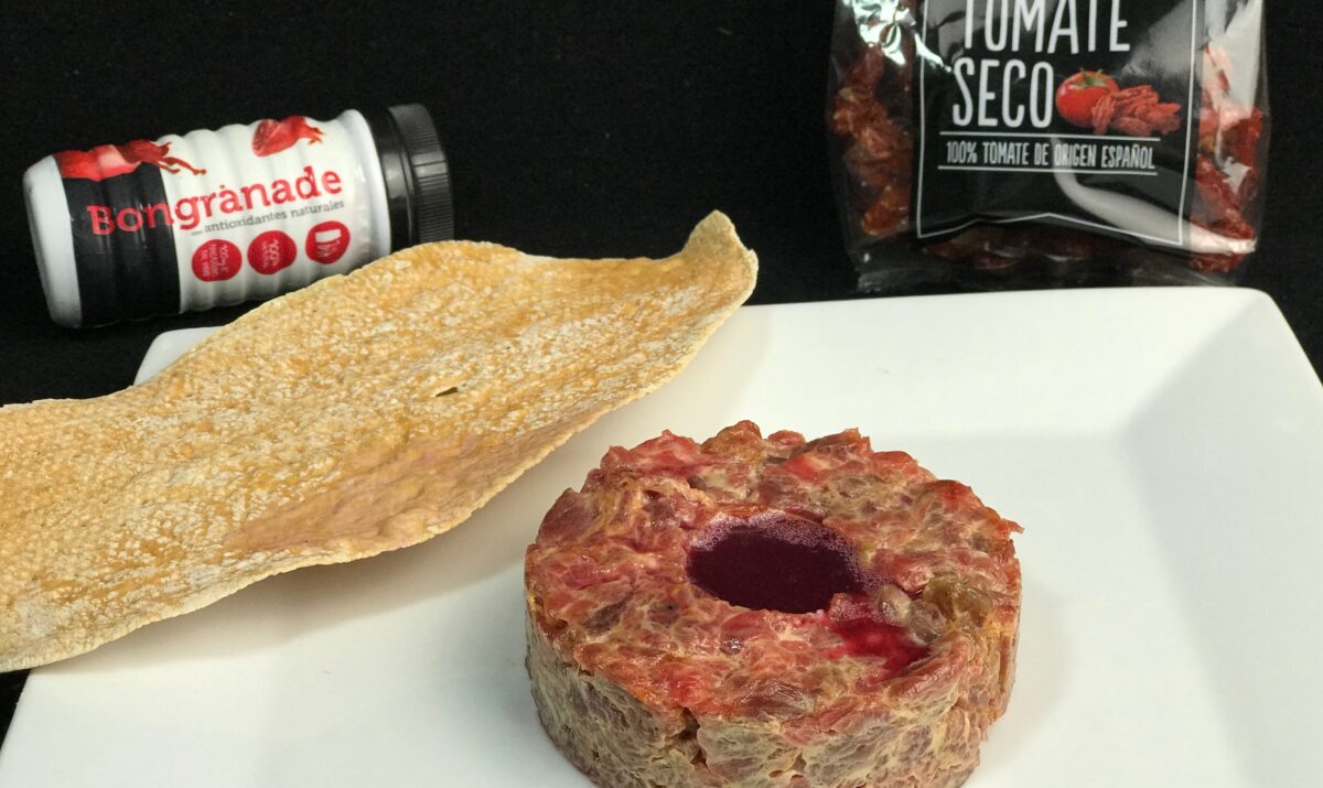 Cortamos a cuchillo la carne en trozos pequeños y colocamos en un recipiente, picamos los tomates deshidratados y se los añadimos a la carne junto el tabasco, mostaza y mayonesa, movemos todo bien y añadimos sal y pimienta y volvemos a mover todo. Emplatamos con ayuda de dos aros de diferente tamaño, dejando así un hueco en el centro, donde delante del comensal rellenaremos con el zumo frio de granada. En ese momento el comensal termina de mezclar los ingredientes para disfrutar de un jugoso y fantastico steak tartar con el exotico toque de la