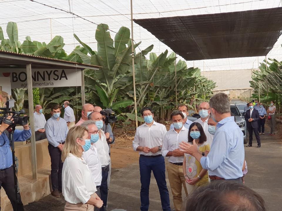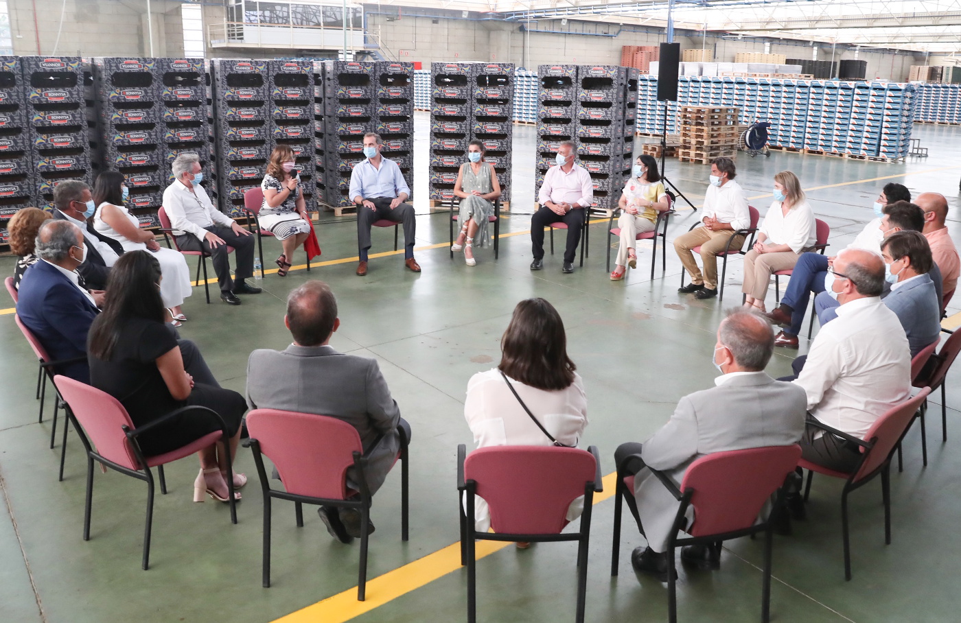Tras la visita al campo, los monarcas se dirigieron a la planta de empaquetado “Las Moradas”, donde se mantuvo una reunión con representantes del sector (agricultura, ganadería, pesca y desarrollo rural) de las Islas Canarias. El Rey, Felipe VI, volvió a mencionar la importancia que ha tenido el sector en estos momentos y la necesidad de potenciar las fortalezas que el campo español puede ofrecer a toda la UE. En este sentido, Jorge Brotóns, explicó las dificultades en las que se encuentra el sector debido a la competencia de países terceros y en la necesidad del cumplimiento del convenio que existe de comercio por parte de las autoridades europeas.